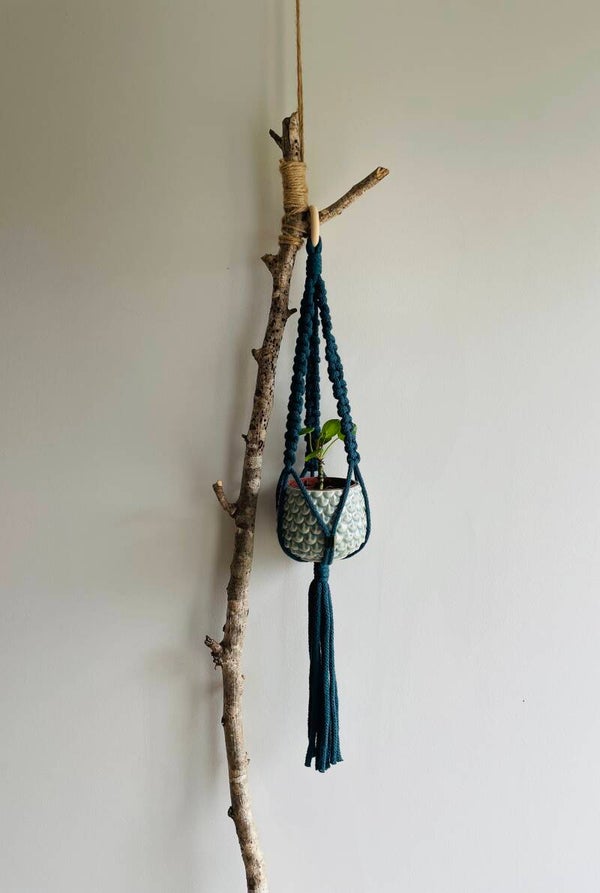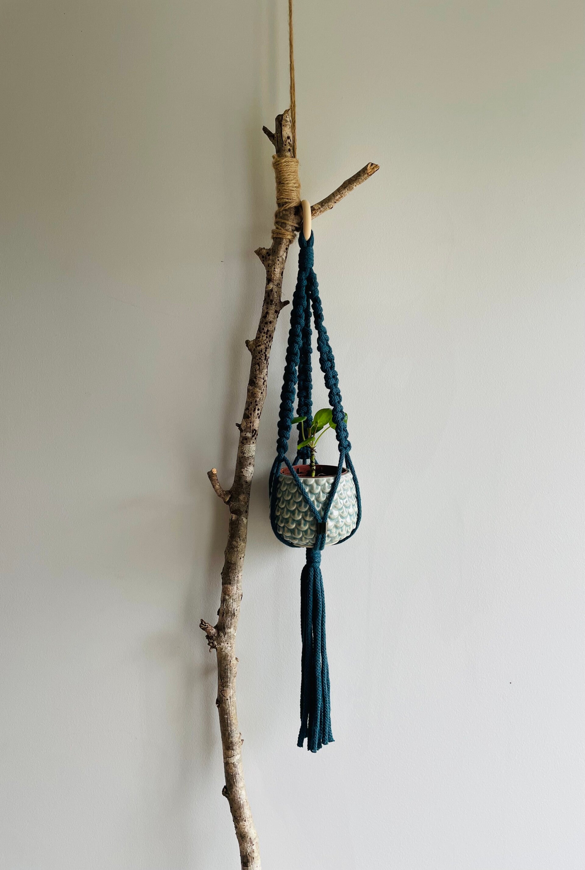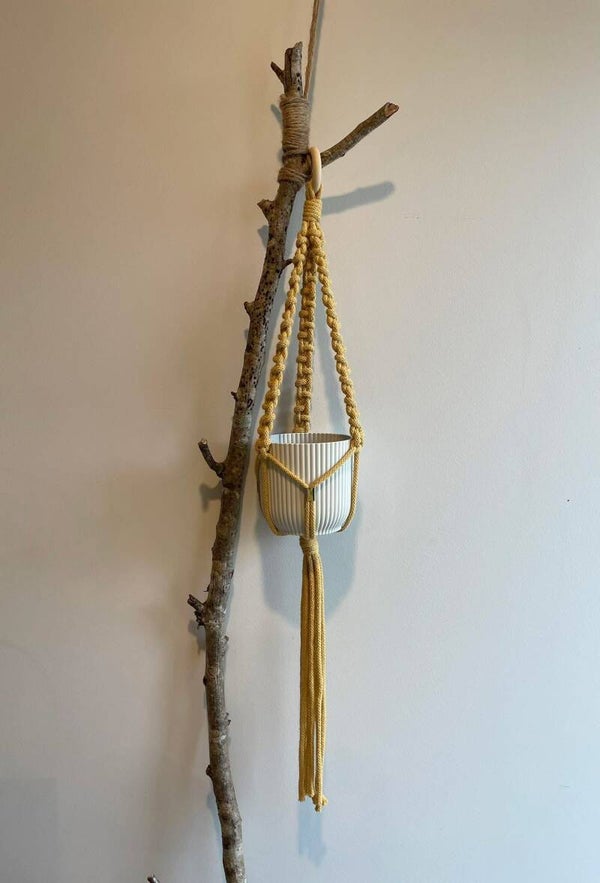 Suspension d'une longueur sans le pot de fleurs d'environ 65cm, faite avec du fil en coton tressé de 5mm.